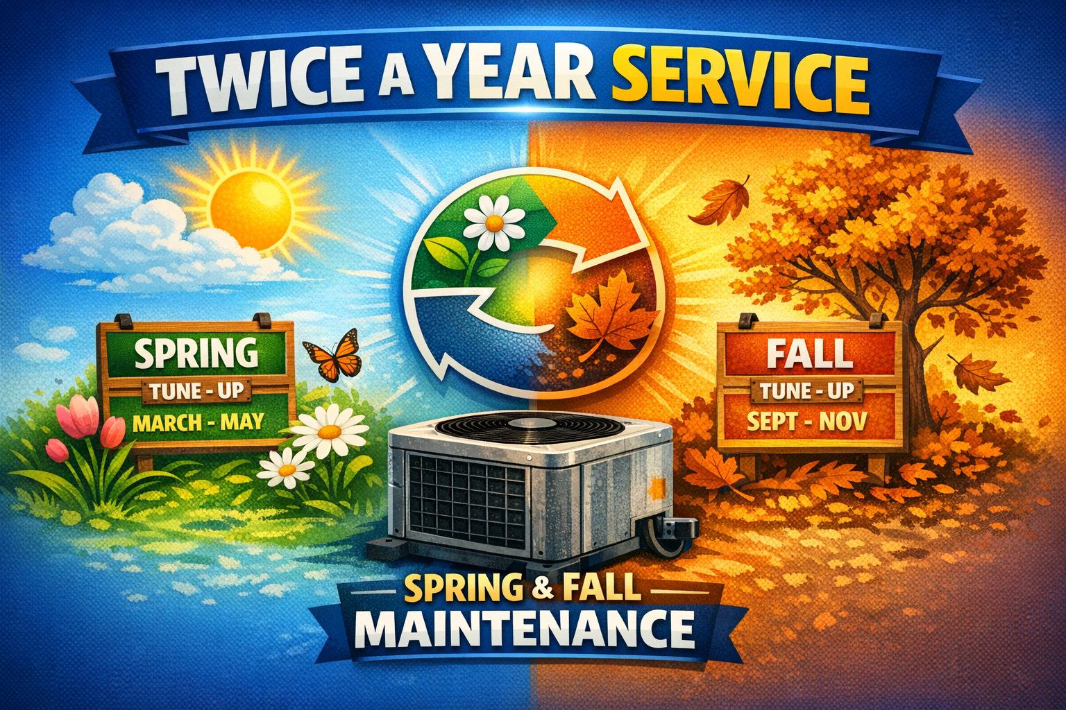 To keep your air conditioner running efficiently and avoid costly repairs, it should be serviced twice a year — once in the spring before cooling season and once in the fall before heating season. Regular maintenance helps: