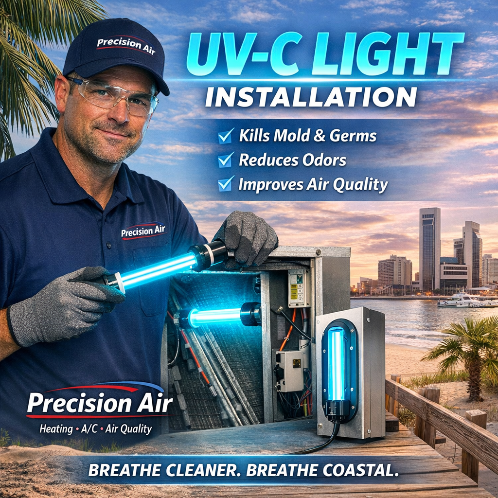 Precision Air installs professional-grade UV-C lights designed specifically for HVAC systems, giving your home or business a powerful layer of protection against bacteria, mold, and viruses.